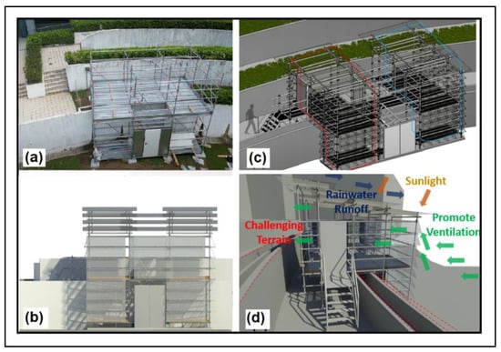 The Food and Agriculture Organization reported that urban agriculture has attracted more than half a billion people worldwide. This has a global contribution of 15% of food production [1]. In developed cities, urban agriculture is being reformed to produce food on a commercial scale [1]. One common constraint faced by urban farming is land scarcity. The urban farms should be highly productive with minimum dependency on artificial resources for the land-scarce urban environment [2]. According to Worldometer [3], Singapore’s population has increased from 1 million in 1950 to 5.8 million in 2020, and it may reach 6.9 million by the end of 2030. Singapore is the second most densely populated country in the world with limited land resources. Its high-rise buildings offer large surface areas of walls and roofs [4]. More than 90% of the food supply relies on overseas imports [5]. The scarcity of agricultural land, high costs, and disruption of supply chains due to conflict and pandemics have highlighted the need to develop a reliable and eco-resilient farming module [2]. With the aid of advanced technology, farming indoors is now possible; substituting sunlight with artificial LED lighting assists crops in making food through photosynthesis. Optimal Heat Ventilation and Air Conditioning (HVAC) systems promote crop growth and reduce the demand for water supply in controlled growth environments [6]. Indoor farming includes vertical farming, which allows crops to be vertically stacked in layers, but this has high variable costs with electrical bills for ventilation and lighting. Another type of indoor farming is rooftop farming on buildings with the advantage of using natural sunlight. Both methods of farming maximize the crop output within limited land space [7,8]. Utilization of the rooftops of Housing & Development Board (HDB) buildings to produce crops would be an added advantage for urban farming. However, current urban rooftop spaces are used for mechanical and electrical (M&E) amenities such as air-conditioning cooling units and water tanks. Competitive needs will require that the vertical structure constructed be modular and easy to plug in and use. Vertical farming on the building façade also offers additional advantages for the occupants. Especially in Singapore, which has a tropical climate throughout the year, the vertical farming of crops on the façade and rooftop would protect the building from excessive heat gain, which places higher demands on air-conditioning cooling. The setting up of urban farming on a rooftop will provide shade to the roof as well as provide a trans-evaporation effect as the crops grow, filtering out fine dust and thus improving air quality. Polycarbonate materials are used instead of traditional glass for the vertical farm as it helps to diffuse light more evenly than glass greenhouses. This helps plants thrive and even grow faster. Polycarbonate protects plants from excessive sunlight or radiation as it naturally offers UV protection.