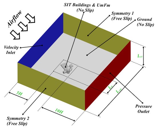 Figure 2 illustrates the computational domain dimensions and the applied boundary conditions. The dimensions of the computational domain were selected based on the guidelines stated in the best practice in the field of urban aerodynamics CFD simulations [18,19]. The upstream distance from the velocity inlet is 5H, where H is the height for the tallest building in the urban area of interest. In this case, the height for a building, 5 is taken as a reference, as depicted in Figure 2. The downstream distance from the SIT buildings to the pressure outlet boundary condition is 10H.