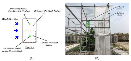 Experimental setup for testing the effect of mesh netting; (a) schematic drawing, (b) actual setup at Oasis Living lab.