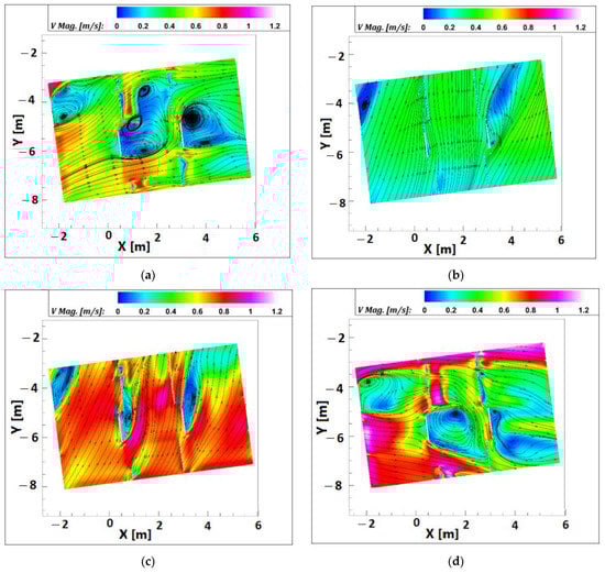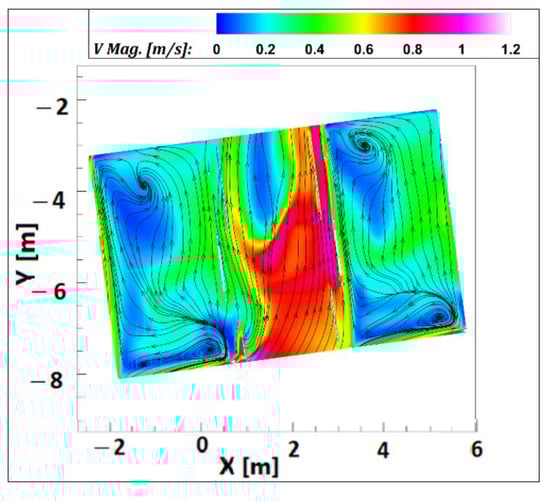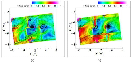 Flow structure inside the UmFm for the north-east wind scenario at 1.35 m above the second floor’s level and façade’s panels at 45° with mesh netting (while Figure 5c shows the UmFm without mesh netting).
