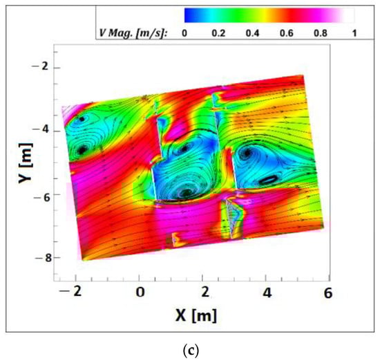 Flow structure inside the UmFm at 1.35 m above the second floor’s level in case of south wind scenario; (a) façade’s panels at 25°, (b) façade’s panels at 45°, (c) façade’s panels at 60°.