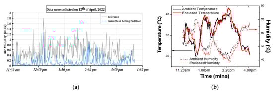 The on-site sensing of the temperature and relative humidity was carried out. The record of the temperature profile and humidity for the external ambient condition as compared to that in the mesh netting and polycarbonate was as shown in Figure 7b. The positions for the placement of the sensors with the data loggers were at the same regions of placement used for the air velocity sensors, as shown in Figure 3a. The enclosed area by the mesh netting with the polycarbonate rooftop has the effect of providing an air insulation layer. This leads to a longer period before temperatures rise. On the other hand, the humidity built up in the enclosed mesh takes a longer period as well to reach its peak and it is lower than the ambient humidity by 5% due to constraints in the airflow and regulation into and from the mesh netting. The enclosed area has minimal temperature and humidity variation as compared to the outdoor environment, which allows the vapor pressure to be better controlled when the crops are in the specific temperature and humidity ranges [34].