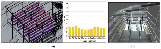 The annual solar irradiation which Singapore receives is approximately 1580 to 1620 kWh/m2. Compared to the annual readings of Singapore, the planter boxes were only facing 614 kWh/m2 of solar radiation per year, as shown in Figure 8a. This is due to the sun’s path and the partial shading due to surrounding high-rise buildings at different times of the day. The “A”-frame planter boxes will be the most ideal for implementation at the site considering that shading will be more prominent if the planter box is in the vertical layout. The average solar exposure in different months is also shown and it varied from 40 to 62 kWh/m2. The approximate PPFD based on annual solar radiation of 614 kWh/m2 is about 320.31 μmol/m2·s [35]. Hence, we can deduce that the crops will be receiving sufficient annual solar radiation throughout the year.
