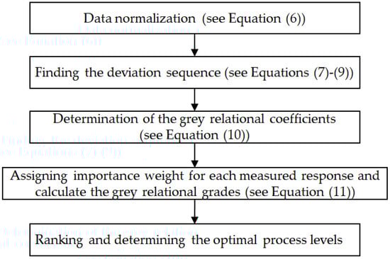 - The eighth step is to apply the multi-objective optimization using the grey relational analysis (GRA). GRA can be adapted for solving the complex interrelationships between the designated performance characteristics. Through this analysis, the grey relational grade (GRG) is defined favorably as an indicator for evaluating multiple performance characteristics. In recent years, grey relational analysis has emerged as an effective method for analyzing processes with multiple performance characteristics. It provides solutions for situations in which some information is known and some is unknown; consequently, it only provides a level-based solution. Various studies [25,26] have utilized it to determine the optimal operating levels associated with multiple performance characteristics in machining processes. GRA techniques consist of the following summarized stages (see Figure 2): (a) data normalization, (b) finding the deviation sequence for each measured response, (c) the determination of the grey relational coefficients, (d) assigning importance weight for each measured response and calculating the grey relational grades, and (e) ranking and determining the optimal process levels. For the first stage, linear normalization is used to normalize the data. The normalization is performed using Equation (6) as all studied responses have “smaller-the-better”-based characteristics.