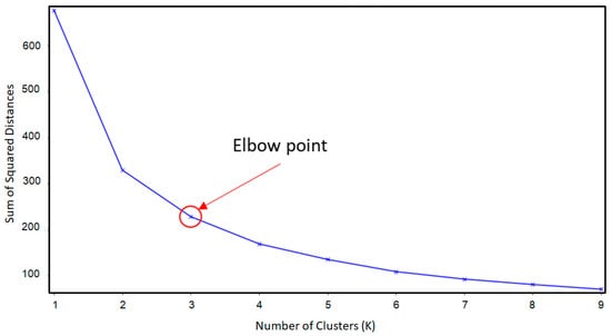 - The second step is to use the elbow graphical method to find the optimal number of clusters. The best number of clusters to describe a given dataset is determined iteratively [22,23]. The elbow method computes the sum of squared distances of samples to their nearest cluster center for each number of clusters K, weighted by the sample weights if provided [22]. The elbow-point is the optimal number of clusters for a particular dataset [22,23].