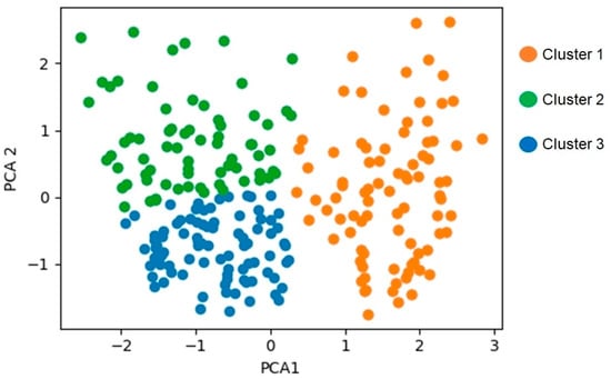 Figure 4. The three generated clusters using the K-means based on the two normalized principal components.