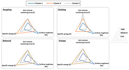 To visualize the obtained results after implementing the developed approach, Figure 5 is generated. Figure 5 shows a comparison of the optimal responses of the different machining scenarios (i.e., roughing, finishing, balanced, entropy) for the three determined clusters. Cluster 1 provides better performance in terms of surface roughness (i.e., a minimum improvement of ~18% and ~67% compared to cluster 2 and cluster 3, respectively). Significantly, such improvement in surface quality can be observed in the finishing and entropy-based scenarios. It should be also stated that lower specific energy values have been observed within cluster 2 for all studied scenarios (i.e., a minimum improvement of ~32% and ~19% compared to cluster 1 and cluster 3, respectively). In terms of unit volume machining time, clusters 2 and 3 offered better performance compared to cluster 1, and the results were comparable for clusters 2 and 3 within all scenarios except the finishing scenario, where cluster 3 offered lower unit volume machine time by almost 25.1%. This reveals the importance of the data clustering, where every cluster may present superiority in one or more obtained responses. Furthermore, such analysis can provide the decision maker with enough flexibility to select the optimal cutting settings under different scenarios, and it also provides the freedom to switch between different clusters and/or scenarios with extremely minimal efforts.