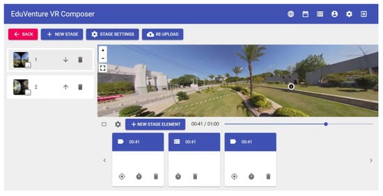 In order to better apply the SV-IVR to a landscape architecture conservation course, this study developed an SV-IVR learning system for a landscape planning and conservation course with a multisensory integration of visual, auditory and olfactory senses. This study used the EduVenture VR platform developed by a university in Hong Kong as a development tool (EduVenture VR is a platform that specializes in the editing and design of VR teaching resources), as shown in Figure 1 [37]. Through this development tool, we built the SV-IVR learning system. The whole learning system is very simple and easy to understand. The system contains three modules: the learning material editing module, the database module and SV-IVR learning. The teacher sets up teaching materials on the EduVenture VR platform; then, students can learn through the EduVenture VR application. In the learning material editing module, teachers can import pictures and videos taken through 360-degree panoramic cameras or obtained from other sources, and then process teaching materials and design teaching processes according to teaching requirements. Depending on the needs of the landscape architecture conservation course, the teacher can import audio and questions needed for the teaching process in the editing module for the panoramic images or videos. At the same time, the teacher can also use the data code to control when to release scents, play the ambient sounds, etc., as a way to improve the immersion of the learning system. The teacher-side display screen is shown in Figure 2.