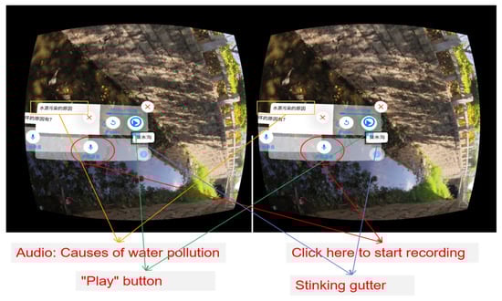 In the multisensory SV-IVR learning system, students engage in a multi-level cycle of learning. Students follow the teacher’s instructional design and the content guidance of the video and audio teaching materials. For example, in the case of the causes of landscape pollution, teachers include pre-recorded video and audio files when designing teaching materials (audio includes ambient sounds recorded on site and other audio material needed for teaching). After a period of study, the system automatically presents a question and asks students to record audio to answer the teacher’s questions (Figure 4). The pop-up question is “What are the main causes of pollution in this area”, and students answer based on their knowledge (Figure 5). Only when they have answered the question correctly and finished recording the audio can they jump to the next learning session; otherwise, they have to pass through the session again.