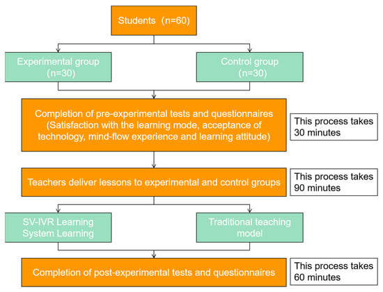 Figure 8 shows the detailed process of the experiment. In total, 60 students were divided into two groups. The experimental group used the multisensory SV-IVR learning system to learn with Google Cardboard; an explanation of SV-IVR was presented through smartphones after entering the learning system. The control group used a traditional teaching model using traditional multimedia lectures, including PowerPoint presentations, pictures and video presentations and the teacher giving the lecture. Before the experiment started, 60 students were given a pre-experimental test consisting of a questionnaire with four sections: learning model satisfaction, technology acceptance, flow experience and learning attitudes, with the process taking about 30 min. In order to eliminate the psychological impact of the different teaching modes on the students, the two groups of students were not informed of the different teaching modes in class from the beginning to the end of the experiment. After completing the pre-experimental test, the teacher taught the two classes for 90 min. Considering that teachers may not have a high level of mastery of the SV-IVR system, we let them learn the system before the experiment started to ensure that there were no errors caused by improper teacher operation. After the lectures were completed, we organized a course exam for students on landscape planning and conservation, which included mastery of landscape architecture conservation methods and skills and suggestions for landscape architecture conservation. After the course exam, all students filled out a post-lab test questionnaire, with the process taking 60 min.