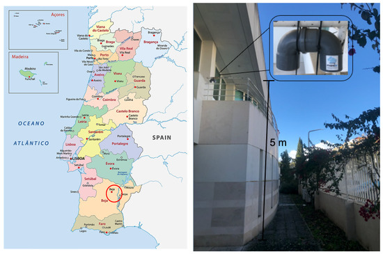 The experimental equipment quantifies the concentration of particulate matter in the air and monitors the meteorological parameters in the Agrarian School of the Polytechnic Institute of Beja in the Alentejo Region in Portugal (Figure 1). It is housed on the first floor, about five meters high and four meters away from the street, where there is intense vehicle traffic.