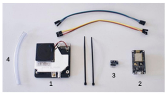 Figure 2 shows the inside of the equipment, containing a NOVA SDS011 particle sensor (1), an ESP8266 NodeMCUv3 microcontroller (2), a BME280 temperature, humidity and pressure sensor (3) and a suction tube (4).