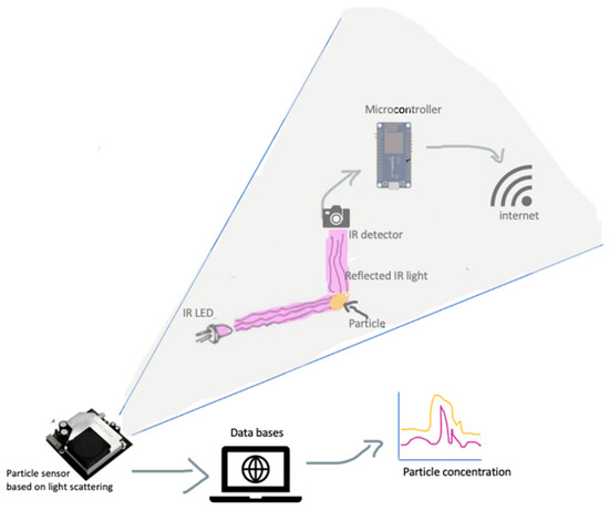 Figure 3 shows the data acquisition scheme, step by step, where the sensor received the reflected IR light from an IR LED. After this, the data are sent to a microcontroller that sends the data to the internet by Wi-Fi, after which it is possible to verify the data and see the particle concentration in graphics.
