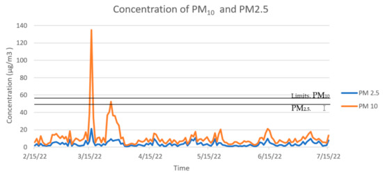 The results of the monitoring of particulate matter 10 and 2.5 obtained during the spring and summer in the city of Beja in Alentejo, Portugal, are shown in Figure 4. The results mostly remain within the standards reviewed by the legislation. Beja is the capital of Alentejo, but the region is not very populous and has a large geographical area that helps in the dispersion of pollutants.