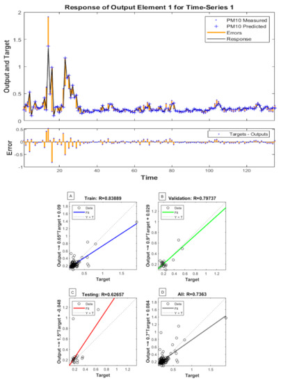 Result of the PM10 concentration prediction of the NARX model and regression charts for (A) training, (B) validation, (C) test and (D) all data considering the NARX PM10 model.