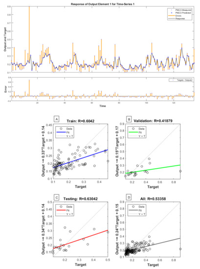 Result of the PM2.5 concentration prediction of the NARX model and regression charts for (A) training, (B) validation, (C) testing, and (D) all data considering the NARX PM2.5 model.