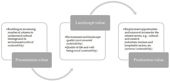 As shown in Figure 1, these three values are intrinsically connected to sustainability. Presentation value targets cultural sustainability, while landscape value can generate both environmental sustainability, in terms of environment and landscape quality, and social sustainability, by improving quality of life. Finally, production value contributes to economic sustainability. Thus, the proper use of cultural heritage can trigger a virtuous sustainable cycle. Increasing numbers of citizens with a better understanding of cultural heritage and its environment (cultural sustainability) “leads to people valuing it more and as a consequence caring for it better” [], thus improving the environment and landscape quality (environmental sustainability) and promoting quality of life and well-being (social sustainability) []. Moreover, the enhancement of cultural heritage can create job opportunities and attract tourists, making it a source of income for the cultural and creative industries, the tourism and hospitality sectors, etc. (economic sustainability).