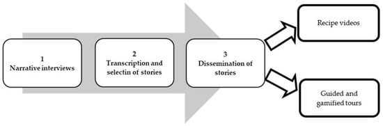 In both cases, the tool used is storytelling, which Serrat [] (p. 839) defines as “the vivid description of ideas, beliefs, personal experiences and life-lessons through stories or narratives that evoke powerful emotions and insights”. Storytelling is a key medium in this project, as it can play an important role in saving and disseminating cultural heritage []. Indeed, storytelling can be useful for disseminating cultural heritage in several ways [,,,,]: