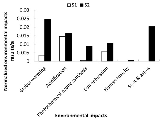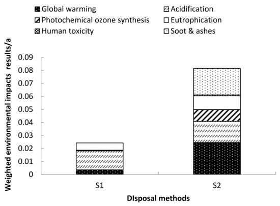 In addition to the gaseous pollutants other than NH3, the equivalent factors were used to convert the pollutants with the same environmental impact effect into standard reference materials, then the normalization coefficients and the relevant weighting coefficients of the reference emissions of World 2000 in CML-IA, were used for environmental impact analysis. Based on the pollutant discharges from the two disposal methods, we selected six types of environmental impacts including Global Warming, Acidification, Photochemical Ozone Synthesis, Eutrophication, Human Toxicity, and Soot and Ashes, and the values of each parameter and the environmental impacts were analyzed. The equivalent factor, normalization coefficient, and weighting coefficients are shown in Table 2.