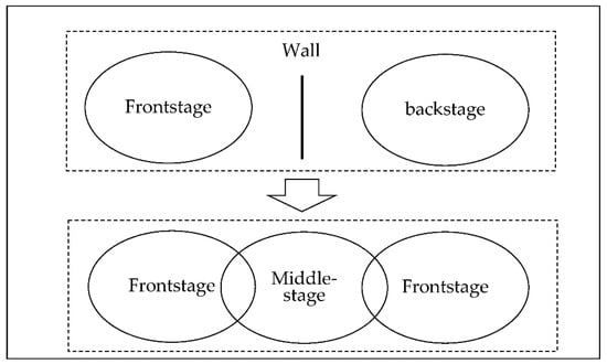 Based on the research perspective of the “spatial turn” of sociology and the “cultural turn” of geography [25], researchers began to incorporate space as an essential concept into the research paradigm of tourism reconstruction and change [26]. Goffman’s (1959) [27] sociological image of dramaturgical and the metaphor of “life as a theatre” have been used to explore how reality is co-constructed and jointly negotiated through the stage space [28]. MacCannell [29] introduced Goffman’s Dramaturgy into tourism research, The staged experience consumed by visitors is considered the frontstage presentation of the culture, and the actual everyday life of the hosts is kept backstage, out of the view of visitors [30]. It was initially created to meet the needs of tourists and to secure the hosts’ fragile “real lives” concerning the frontstage and backstage regions [29].