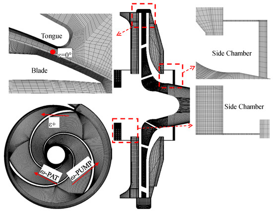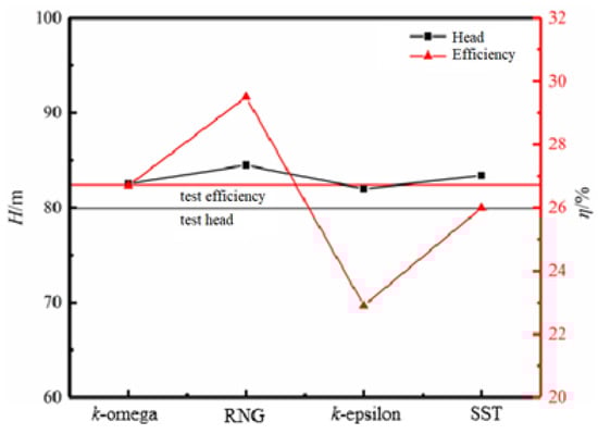 Figure 3 shows the comparison between the calculated and experimental values at the design condition for different turbulence models [27]. The calculation results of the SST k-ω turbulence model agrees well with the experimental data compared to other turbulent models [28,29,30]. Thus, it is chosen for the turbulence model of the numerical simulation in this study. The boundary conditions are set as the total pressure at the inlet of the pump, the mass flow at the outlet of the pump. The outlet pressure is set to 1 atm. No-slip wall is applied to all the walls. The interface between the rotor and the stator selects the frozen rotor condition when in the steady calculation and selects the transient rotor-stator condition when in the unsteady calculation [31]. The initial field of transient simulation is set to the result of the steady calculation. The unsteady calculation time step is 5.75 × 10−5 which equals to 1° rotation of the impeller. A transient simulation is conducted for 6 revolutions of the impeller. And the calculation data of the last revolution is chosen for the analysis of the pressure and power fluctuation.