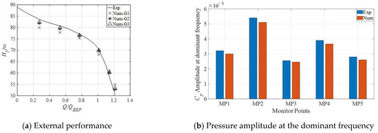 The comparison of the performance between the numerical calculation and experiment is shown in Figure 4a. The head of the pump decreases with the increase of the flow rate. As the number of grids increases, the difference between the experimental head and the numerical head becomes smaller. Considering the computational cost, scheme G2 was selected for numerical simulation in this study. Figure 4b presents the pressure amplitude at the dominant frequency of the monitoring points in Figure 1. The dominant frequency of pressure pulsation obtained by numerical simulation and experiment both occurs at the blade frequency, and the amplitude is similar.