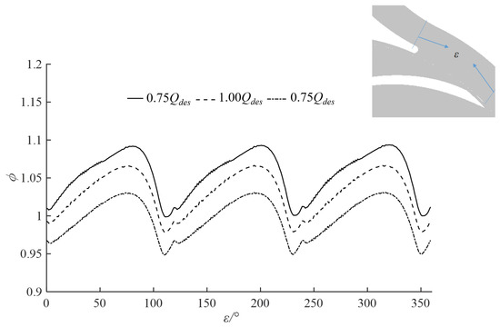 Figure 5 shows the unsteady head of the pump in one rotation cycle. Here, ε is the angle between the trailing edge of the blade and the volute tongue. The ε is zero when the blade trailing edge is passing the tongue. The head gradually increases with the decrease in flow rate. The head coefficient shows obvious periodic fluctuation, and the fluctuation law is similar under different discharge. It is well understood that the number of cycles is the same as the number of blades of the impeller. Therefore, the key to the problem is the reason that affects the transient change trend. For the minimum value of pulsation, it is obviously the interaction between the fluid at the tail of the impeller and the tongue. In particular, there is a quadratic fluctuation at the valley of the curve shown in Figure 5. This may be related to the rotor-stator interaction between the impeller and the tongue. When the pressure side of the blade sweeps across the tongue, its unsteady head reaches the minimum value. With the rotation of the blade, a secondary fluctuation occurs when the suction side of the blade sweeps across the tongue. As the blade continues to rotate, the unsteady head gradually rises to the maximum value. Therefore, the blade thickness may be the cause of secondary fluctuation. The comprehensive fluctuation of the unsteady head coefficient is closely related to the unsteady flow field.
