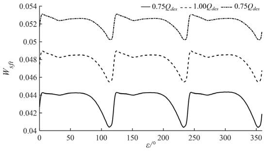 Figure 6 shows the unsteady fluctuation curve of the impeller shaft power during one impeller rotation. The shaft power increases with the increase of the flow rate, and the oscillation trend of the shaft power coefficient curve is similar under different flow rates, which shows obvious periodic fluctuations. With the blades rotating from the tongue, the shaft power rapidly increases to a maximum value. The reduction of shaft power will go through three stages. First, the shaft power will slowly decrease, then increase in a gentler trend, and finally, rapidly reduce to the minimum value. Compared with Figure 5, when the blade rotates 120°, there is no secondary fluctuation like the head coefficient, which indicates that the influence of this transient effect on the impeller is very weak.