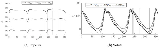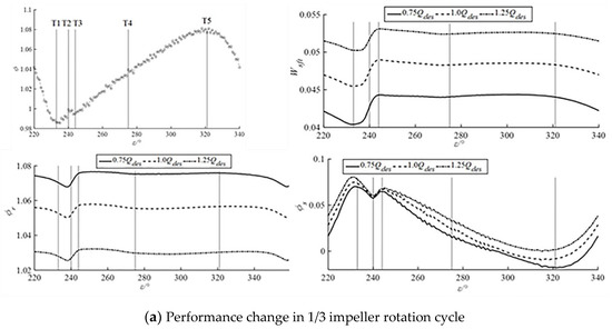 Within one cycle of the impeller, the pressure rises of impeller and pressure drop of volute are shown in Figure 7. With the increase in the flow rate, the pressure rise coefficient in the impeller presents a decreasing trend while it has the opposite trend in the volute. Moreover, the pressure rise coefficient of the impeller is close to the head coefficient, which means that most of the water losses occur in the impeller. Therefore, the flow field in the impeller determines the hydraulic performance. However, the fluctuation of the impeller pressure rise coefficient is 0.01 times of the head coefficient and mainly occurs near the tongue, which indicates that the loss of the impeller is not the main reason for determining the hydraulic fluctuation. The pressure drop coefficient of volute is very small, but the fluctuation is more obvious, and the fluctuation amplitude can be close to 0.1. Therefore, although the hydraulic loss of volute is small, it is the main factor affecting the fluctuation range of hydraulic performance. This also indirectly shows that the rotor-stator interaction has a greater impact on the flow field of the volute.