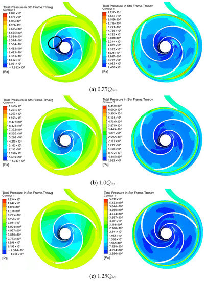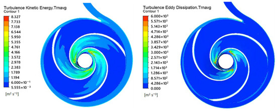 Before studying the large hydraulic fluctuation of the volute, it is necessary to explore the hydraulic loss and flow characteristics of the impeller. Figure 8 shows the average value and variance distribution of pressure in the mid-span section of the pump. The time-averaged values of turbulent kinetic energy and dissipation rate under design flow rate are presented at Figure 9. The pressure increases gradually from the impeller inlet to the outlet. Due to the pressure loss caused by the leakage of the balance hole in the pump casings, the pressure at the impeller inlet is very small. In general, the maximum pressure appears in the impeller outlet. With the increasing flow rate, pressure of inlet gradually increases. As can be seen from the oval marked area, the low pressure is mainly distributed in the region around the impeller inlet. The maximal variance value of the pressure occurs on the interface of the impeller and volute, especially in the regions near the blade trailing edge. As the flow rate increases, the pressure at the inlet of the impeller also increases, causing the head to drop. As shown in Figure 9, the dissipation of turbulent kinetic energy mainly occurs at the balance hole at the impeller inlet. This is the main reason for inducing hydraulic loss. Since it is far from the interface between impeller and volute and located in the upstream area, it is less subject to rotor-stator interaction. Therefore, the pressure rise coefficient of the impeller changes slightly, and only changes greatly before and after passing through the tongue.