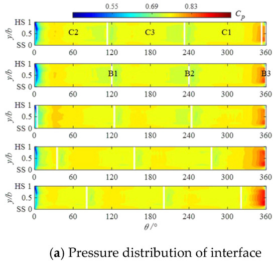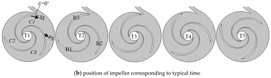 One cycle of the above four external characteristic curves is shown in Figure 10a, and five typical blade rotation angles are shown in Figure 10b. The positions are named T1, T2, T3, T4, and T5 in chronological order. The three flow channels are named C1, C2 and C3 in anticlockwise direction. For convenience, the interface between impeller and volute is hereinafter referred to as interface. Figure 10a more clearly proves that the hydraulic performance can be affected by changing the hydraulic loss and flow field characteristics of the impeller under different flow rates. However, the hydraulic fluctuation characteristics under different flow rates are similar, which is mainly controlled by the flow field in the volute. The rotor-stator interaction mainly affects the flow field of the volute, and the mechanism of this influence will be explained later. There are very similar fluctuation characteristics under different flows, however, the following article pays more attention to the transient changes of hydraulic characteristics in a cycle. Therefore, only the flow field characteristics of design flow are studied to obtain the mechanism of rotor-stator interaction on hydraulic performance.