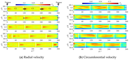 According to Figure 10a, the hydraulic performance change process can be divided into three stages according to the shaft power. In the first stage (T1~T3): the power rise period, the shaft power increases, and the head first increases and then decreases. In the second stage: power stability period (T3~T5), shaft power is stable and head increases. In the third stage (T5~T1): power reduction period, shaft power and head decrease. The hydraulic loss of the volute basically presents the opposite trend to the head. The analysis of the transient characteristics of the flow field at the interface is of great significance to the study of the rotor-stator interaction of centrifugal pumps. Figure 11 shows the distribution of radial velocity and circumferential velocity at the interface, in which HS represents the hub surface and SS represents the shroud surface. And the contours from top to button corresponds to the position of T1, T2, T3, T4, T5 in turn. The velocity distribution at the inlet will directly affect the flow field and energy loss in the volute. The radial velocity difference at different times is small, but the inflow at time T5 is better than that at time T1. This indicates that the volute has lower energy loss and the head will increase at T5. The high value of circumferential velocity is distributed in the region of y/b = 0.25~0.75. The width of the volute inlet is twice that of the impeller outlet, so the area where y/b = 0.0~0.25 is the front pump casing, and the area where y/b = 0.75~1 is the rear pump casing. The area near the vanes and pump casing has a slightly slower speed. Similar to the radial velocity, the flow field from T1 to T3 has no obvious change, but the flow field at T4 and T5 has been significantly improved, which will also improve the hydraulic performance. In addition, for the flow passage near the tongue, the radial velocity and circumferential velocity have large gradients, which makes the fluid have a certain impact on the impeller. Therefore, the impeller shaft power will also change between T1 and T3 (the blade goes across the tongue).