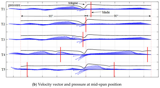 Internal pressure distribution of pump determines the variation of fluid mechanical energy and the transmission of shaft power. Figure 12 shows velocity vector and pressure distribution at interface. Obviously, the pressure fluctuation gradient at T2 is smaller than T1 and T3. This resulted in a small fluctuation of loss coefficient and head at T2. T4 and T5 are similar to the velocity field, and the inlet pressure field of the volute has been further improved. High pressure area and low-pressure area are produced on the left and right sides of the tongue, which affect the flow field near the tongue. To further study the flow field characteristics that cause this phenomenon, the pressure and velocity vectors at the mid-span position in the 180° area near the tongue are selected to obtain Figure 12b. The red dotted line represents the tongue, and the red solid line represents the suction side of the trailing edge of the blade. They are respectively the blue point and the red point in Figure 10b. The solid black line represents the pressure. At time T3, the blade has started to move away from the tongue. With the increase of time, the flow field on the left side of the tongue has been improved. The distance between the tongue and the right blade is not enough to cause greater interaction. Therefore, at T5, the hydraulic loss of the volute is the smallest and the head coefficient is the largest. However, after T5, as the blade approaches the tongue, the tail jet will cause great impact near the tongue, which leads to rapid increase of hydraulic loss and reduction of head. The velocity vector distribution of T1, T2 and T3 has little difference. However, according to the conclusion in Figure 12a and the relative position of the blade and tongue, it can be inferred that the small fluctuations at T2 are related to the thickness of the blade. Assuming that the blade has no thickness, the changes of various hydraulic properties will be monotonic during T1–T5. However, due to the thickness and tangential trailing edge structure of the blade, the flow field near the trailing edge is distorted greatly, so a small secondary wave is finally generated.
