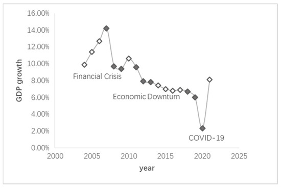 GDP is an important indicator of economic conditions, and the GDP growth rate is a dynamic indicator reflecting the degree of change in the level of economic development in a certain period and is also a basic indicator reflecting the dynamism of a country’s economy. Therefore, this paper adopts the peak method to divide China’s economic cycle from 2007 to 2020 with reference to GDP growth rate, so as to clarify various short-term shocks. From Figure 1, we can visually see that China’s economic development has experienced three relatively obvious short-term shocks. The first was the global financial crisis shock in 2008 (financial crisis), which hit the European and American economies hard and caused a significant decline in China’s foreign exports and economic growth. The second was the structural shock (economic downturn) in 2012, when China’s economic development was in urgent need of industrial transformation and economic structure optimization due to the complex international situation and the long-term path lock of domestic industrial development. Under the internal and external problems, China’s economy entered the growth rate shift period, transitioning from high-speed growth to medium-to-high-speed growth, and economic development slowed down. The third time was the social public safety shock (COVID-19), which caused China and other countries to come to a socio-economic standstill for a time and economic growth fell off a cliff due to the characteristics of the rapid outbreak and wide spread of COVID-19 [38,39,40,41]. Since the downturn economic pressure and COVID-19 are still not over, this paper selects three times cross-sections from 2007–2009, 2011–2013, and 2018–2020 to study the resistance of regional economies in the face of shocks as regional economic resilience.