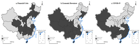 Through measuring the economic resilience of China’s provinces under three different shocks, namely, the financial crisis, the economic downturn, and COVID-19, as well as the main influencing factors, this paper draws the following main conclusions: (1) The economic resilience of provinces under different shocks has very large regional differences. During the financial crisis, the provinces and cities with stronger economic resilience were distributed in the central and western, and northern regions in a circular pattern, and the economic resilience is roughly distributed in the center-periphery in space, with strong resistance in the center and a weak resistance in the periphery; during the economic downturn, the provinces with stronger economic resilience were mainly distributed in the western and central regions; during COVID-19, the regions with stronger economic resilience were mainly concentrated in the northwest, southwest and coastal regions. The economic resilience of each province shows significant “high-high” and “low-low” spatial clustering characteristics during the economic downturn and COVID-19. (2) The main influencing factors on economic resilience under different shocks differed. The explanatory power of the leading industry is stronger during the financial crisis period; the explanatory power of population density and leading industry is stronger during the economic downturn; the explanatory power of related diversity, unrelated diversity, and leading industry are stronger during COVID-19. The explanatory power of the same impact factor on economic resilience also varies across shocks. For example, population density has the strongest explanatory power in the downturn period but the weakest impact during COVID-19. (3) In the interaction of the two-by-two influencing factors, related diversity, unrelated diversity, and leading industry, which represent industrial structure, have stronger explanatory power, and population density has weaker explanatory power.