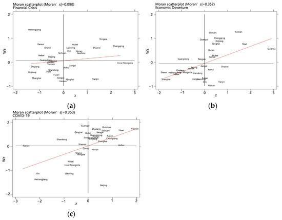 From the values in Table 1, it can be seen that the global Moran index is positive in all three shocks, and the Moran index values are larger and tested significantly at a 1% significance level in the economic downturn and COVID-19. It indicates that the economic resilience of Chinese provinces and cities shows the clustering characteristics of strong resilient provinces and cities adjacent to strong resilient provinces and cities, and weak resilient provinces and cities adjacent to weak resilient provinces and cities.