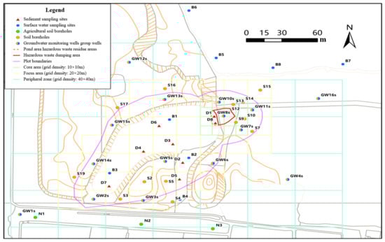 According to the “Technical guidelines for soil pollution risk management and remediation monitoring of construction land” (HJ 25.2-2019), the sampling points of soil, groundwater, surface water, and sediment were arranged by the method of systematic arrangement and expert judgment. A total of twenty-nine soil sampling sites, fifteen groundwater sampling sites, eight surface water sampling sites, and eight sediment sampling sites. Since the pollution of the groundwater was in the two layers, twelve submersible wells and fifteen pressurized water wells were set up to collect the groundwater samples in the area where there are two aquifers. The depth of soil sampling was 0.5 m below the surface water level, and the depth of sediment sampling was 0.5 m and 1.5 m, respectively.