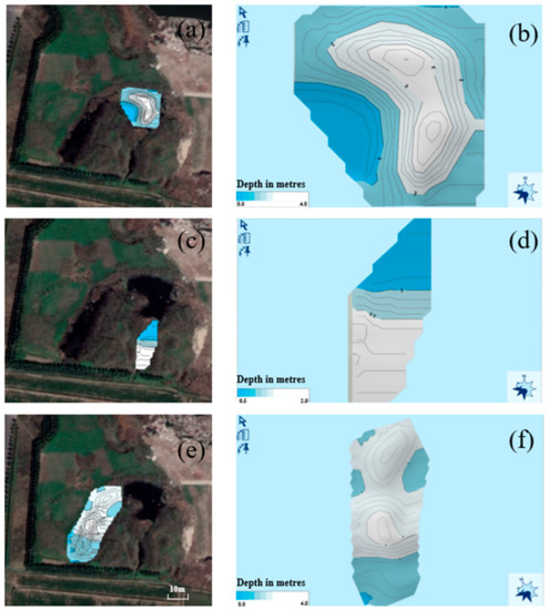 Northside (a) survey area location; (b) pond isobath; east side (c) survey area location; (d) pond isobath; west side (e) survey area location; (f) pond isobath.