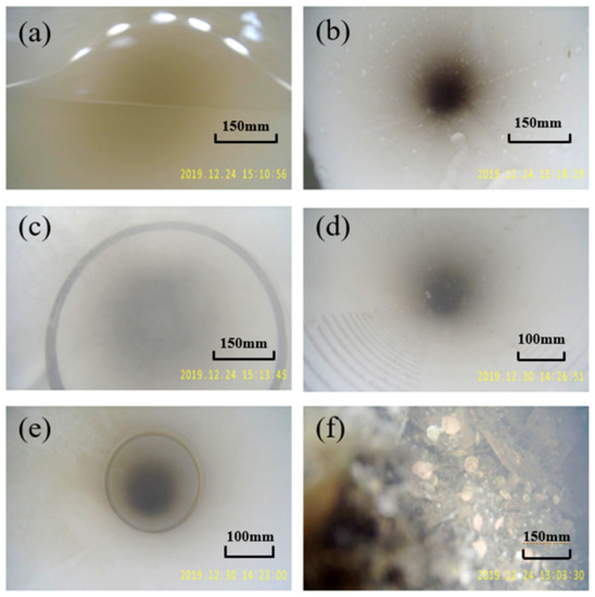 The internal conditions of the monitoring wells were investigated by the imager, mainly to identify the quality conditions of the monitoring wells of the concealed works, such as the location and connection of the screen pipe and white pipe, and the physical properties of the groundwater, and the findings are shown in Figure 3. There was no obvious LNAPL distribution in the groundwater surface of the monitoring wells, the white pipes, and connections of the monitoring wells, and the sieve pipes of the monitoring wells were by the design requirements, the quality of the good washing was good (Figure 3a–c), the groundwater of the monitoring wells had more suspended matter, the groundwater transparency was good, and no obvious traces of oil contamination were found (Figure 3e). In addition, a survey of the internal conditions of the pond’s surface water was carried out to initially map the current state of its bottom, as shown in Figure 3f, with good water clarity and the presence of litter deposits such as leaves and dead branches at the bottom.