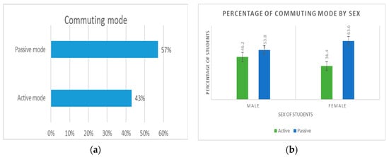 The commuting modes of the students are categorized as “active mode” and “passive mode.” The survey data shows that over half of the students (57%) use passive modes of commuting and 43% commute to university using active modes. Although it is not noticeably higher, as noted in the next section, male students are found to be more likely to use active modes than their female counterparts (Figure 1).