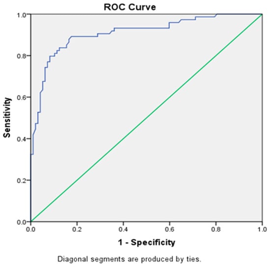 From the multiple logistic regression model, the Hosmer–Lemeshow test gives a value of chi-square = 7.345 and a p-value< 0.05, which means the model has been fitted well. The area under the ROC curve is found to be 0.909, which suggests the better performance of the classification model (Figure 2).