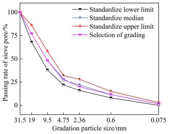 PVA fiber with a length of 12 mm and diameter of 40 μm was selected. The fiber dose was 1 kg/m3, and the control group with a fiber dose of 0% was used for comparison. The fiber surface modifier used epibromohydrin. P.O 42.5 ordinary silicate cement was selected as the cement, and limestone was used as the main aggregate, and the relevant technical indices of the cement and aggregate all met the JTG/T F20-2015 []. Referring to the JTG/T F20-2015 [], the gradation of the mix was C-B-3 and the grade curve is shown in Figure 1. The maximum dry density of cement-stabilized macadam is 2.28 g/cm3, and the optimum moisture content is 4.75% (Table 1).