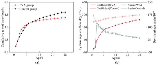 In Figure 2a, both PVA fiber cement-stabilized macadam and ordinary cement-stabilized macadam show a trend of an increasing rate of water loss with age, then gradually slow down and stabilize. The rate of water loss in the first 10 days of the age of the mixture increased faster, among which the rate of water loss of PVA fiber cement-stabilized macadam was relatively faster. The cumulative rate of water loss of PVA fiber cement-stabilized macadam at the age of 28 days was 13.7% lower compared with ordinary cement-stabilized macadam.