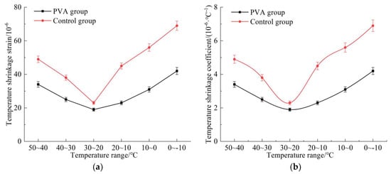 The temperature shrinkage test of cement-stabilized macadam was used to compare and analyze the effect of incorporating PVA fiber on the temperature shrinkage performance of cement-stabilized macadam, with the help of the temperature shrinkage strain and temperature shrinkage coefficient, as shown in Figure 3.