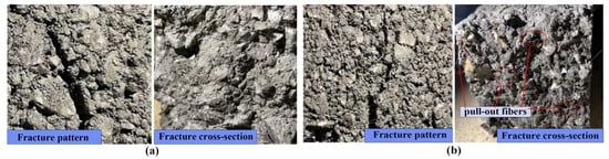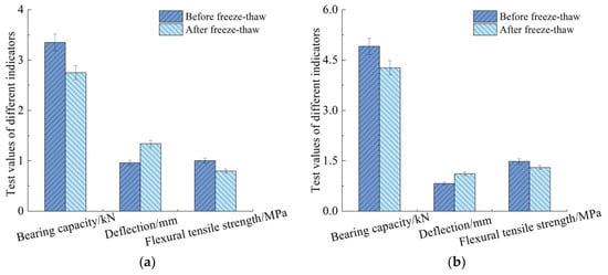 Cement-stabilized macadam should have good low-temperature toughness to withstand long-term environmental temperature changes, wet and dry conditions, freeze–thaw cycles, etc. [,,]. Therefore, the freeze–thaw cycle and three-point bending test were used to compare and evaluate the changes in flexural tensile strength, bearing capacity, and deflection of PVA fiber cement-stabilized macadam before and after the freeze–thaw cycle, as shown in Figure 4, and the fracture patterns of the specimens are shown in Figure 5.