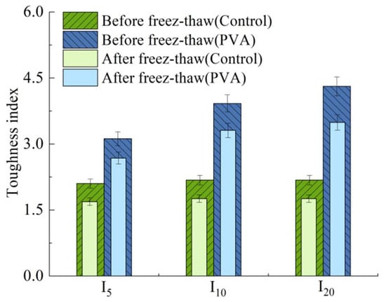 To further quantify the effect of PVA fiber on the low-temperature toughness of cement-stabilized macadam, the low-temperature toughness of PVA fiber cement-stabilized macadam was systematically evaluated using the toughness indices I5, I10, I20, and residual strength indices R5,10 and R10,20 with the help of the ASTM C1018-97 standard toughness evaluation method, as shown in Figure 6 and Figure 7.