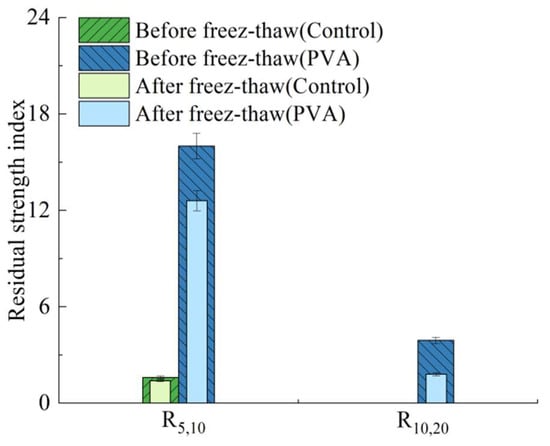 From Figure 6 and Figure 7, it can be observed that the toughness index and residual strength index of cement-stabilized macadam increased significantly after mixing with PVA fiber. The toughness indices I5, I10, and I20 increased by 48.6%, 79.8%, and 97.7%, respectively, and the residual strength indices R5,10 and R10,20 increased by more than 100%. The toughness evaluation index of cement-stabilized macadam decreased to some extent after the freeze–thaw cycles. Among them, the toughness indices of PVA fiber cement-stabilized macadam I5, I10, and I20 decreased by 14.1%, 15.6%, and 19%, respectively, and the residual strength indices R5,10 and R10,20 decreased by 21.3% and 53.8%, respectively. The residual toughness indices increased by 58.6%, 88.1%, and 98.3%, respectively, compared with ordinary cement-stabilized macadam after freeze–thaw, and the residual strength index increased by more than 100%. This indicates that the strong decrease in the mixture is slowed down by the crack-arresting effect of the flexible fibers after the appearance of cracks, while more energy needs to be dissipated for further expansion of the cracks, thus effectively improving the flexural toughness of the cement-stabilized macadam.