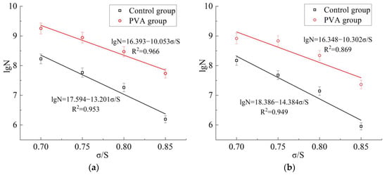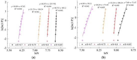 Cement-stabilized macadam needs to have sufficient fatigue resistance to withstand vehicle loading for a long period []. The indoor fatigue tests showed that the fatigue life of cement-stabilized macadam varied at the same stress level, and the test results were discrete; therefore, it was difficult to analyze the fatigue life at different stress levels. In recent years, mathematical analysis methods have been widely used in the field of engineering []. Therefore, to accurately and objectively compare the effects of PVA fibers on the fatigue life of cement-stabilized macadam at different stress levels, the fatigue life of the specimens of cement-stabilized macadam at 28 days was tested by using the linear regression method combined with Weibull distribution []. The reliability and the prediction equations of the fatigue life of cement-stabilized macadam were calculated according to Equations (16) and (17).