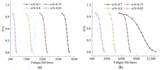 Fatigue life fitting curve with different reliability indices: (a) 50% reliability; (b) 95% reliability.