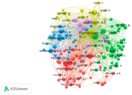 Regarding the relationship between co-citations and authorship in documents related to the keyword ‘digital entrepreneurship’, co-citation among documents was analyzed, setting 50 as the minimum number of citations for an author. Of the 51,611 authors, 147 meet the threshold. For each of the 147 authors, the total strength of the co-citation links with other authors was calculated and authors with more than 200 citations on this topic were selected, as shown in Table 8.